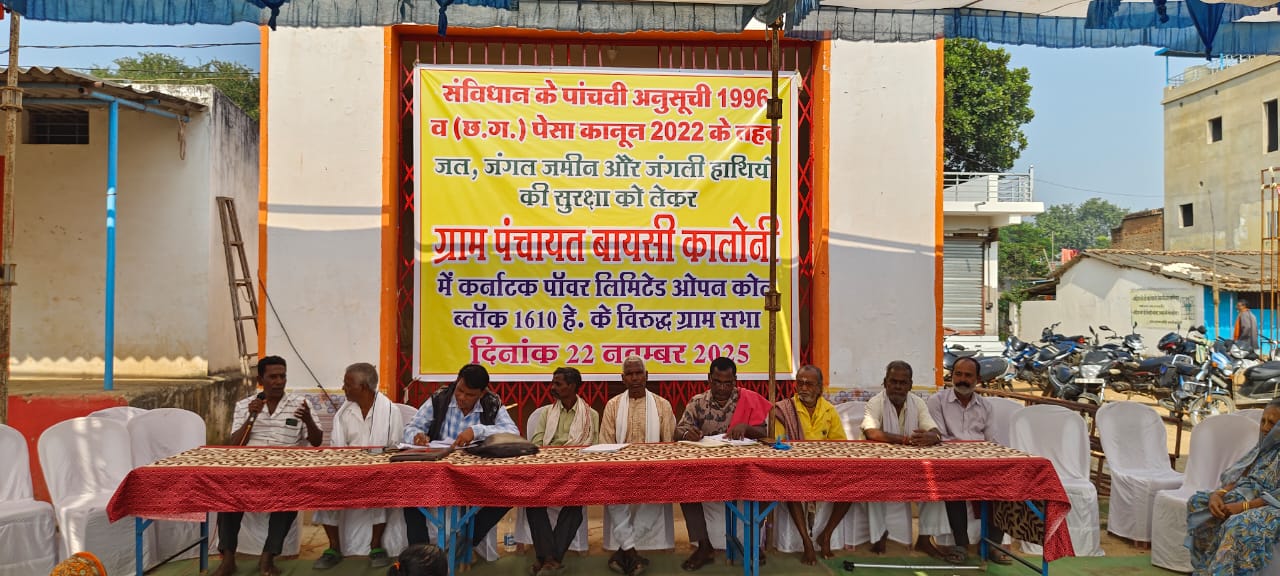 धरमजयगढ़ । ग्राम पंचायत बायसी कालोनी में शुक्रवार 22 नवंबर को आयोजित ऐतिहासिक ग्राम सभा ने कर्नाटक पावर लिमिटेड के प्रस्तावित 1610 हेक्टेयर ओपन कोल ब्लॉक को सर्वसम्मति से सख्ती के साथ निरस्त कर दिया। ग्रामीणों ने पाँचवीं अनुसूची (1996) और छत्तीसगढ़ पेसा अधिनियम 2022 के तहत मिले संवैधानिक अधिकारों का प्रयोग करते हुए स्पष्ट कहा कि जंगल, हाथी, जमीन और खेती बचाने के लिए इस खनन परियोजना को किसी भी कीमत पर स्वीकार नहीं किया जाएगा।